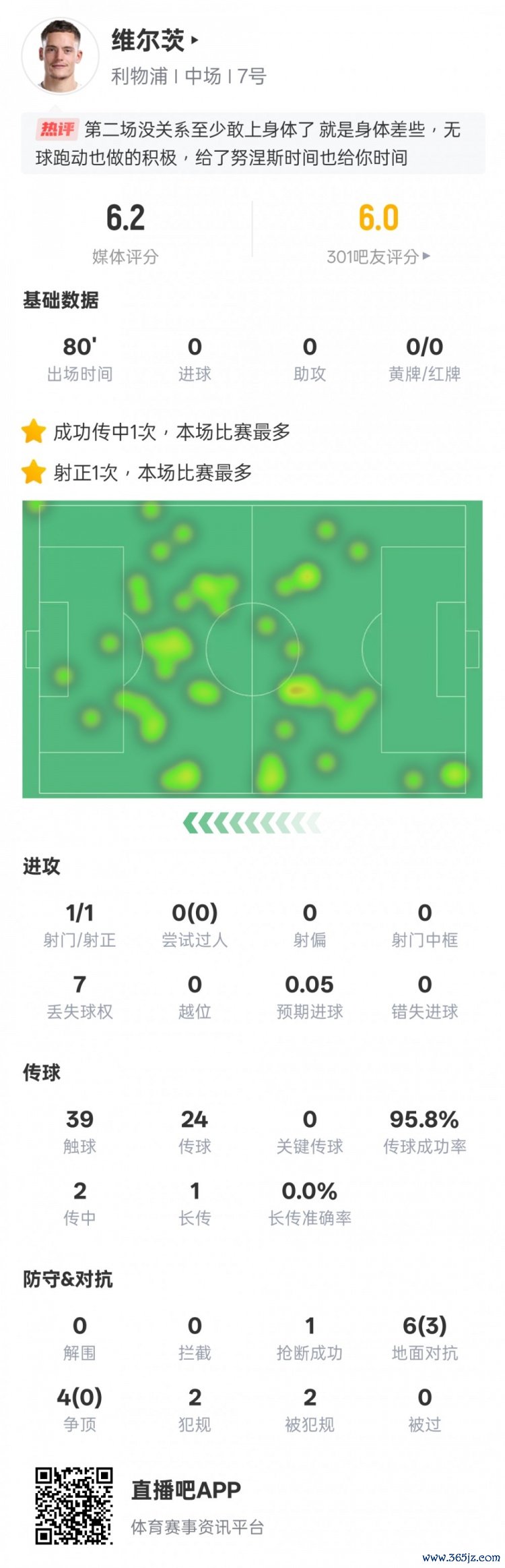8月26日讯 2025-26赛季英超第2轮,利物浦3-2纽卡斯尔。维尔茨首发出战,1次射门1次射正,传球奏遵守95.8%,还有1次抢断,评分6.2。