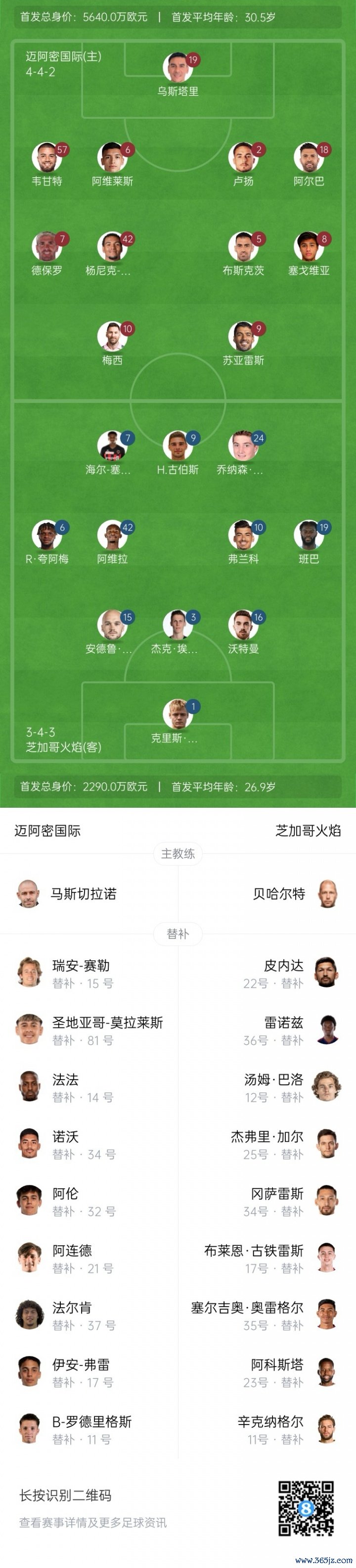 迈阿密外洋首发:19-乌斯塔里、57-韦甘特、6-阿维莱斯、2-卢扬、18-阿尔巴、7-德-保罗、5-布斯克茨、42-布莱特、8-塞戈维亚、10-梅西、9-苏亚雷斯