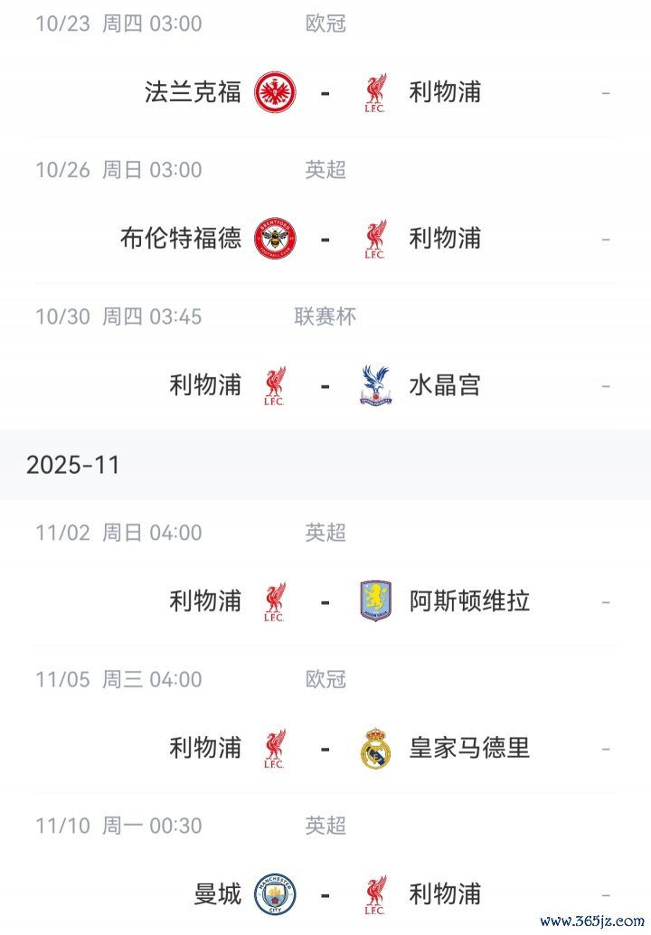 接下来,利物浦将在欧冠小组赛中客场对阵法兰克福,之后在联赛中客场挑战布伦特福德,联赛杯主场迎战水晶宫。