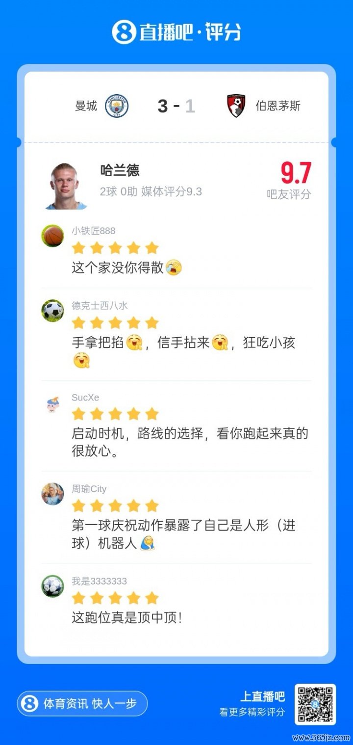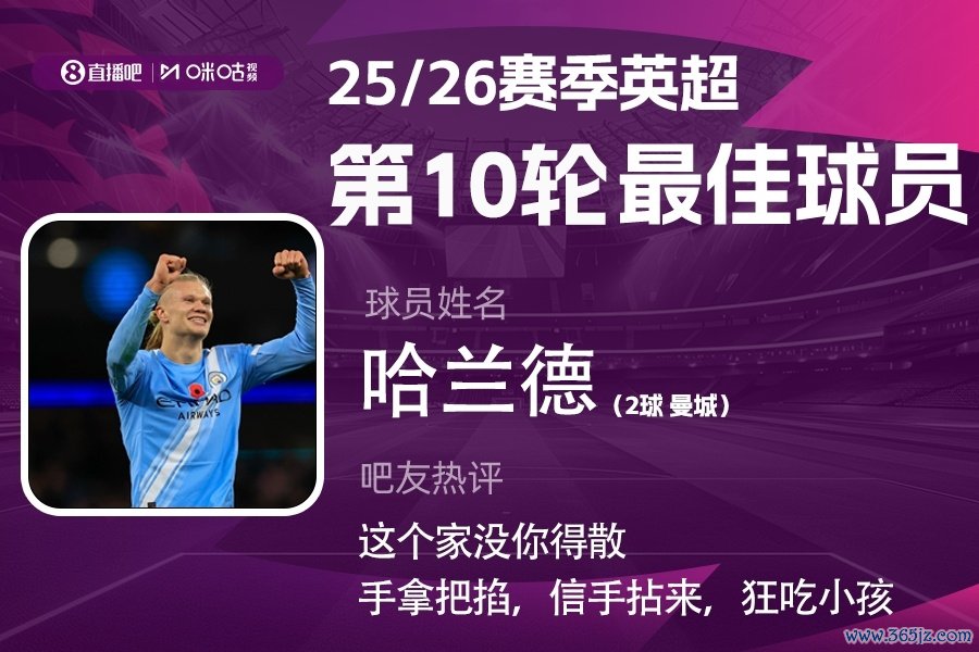 曼城时尚哈兰德梅开二度,匡助曼城3-1驯顺伯恩茅斯升至第二。哈兰德取得吧友超7万的投票,当选【X咪咕体育英超第10轮最好球员】!