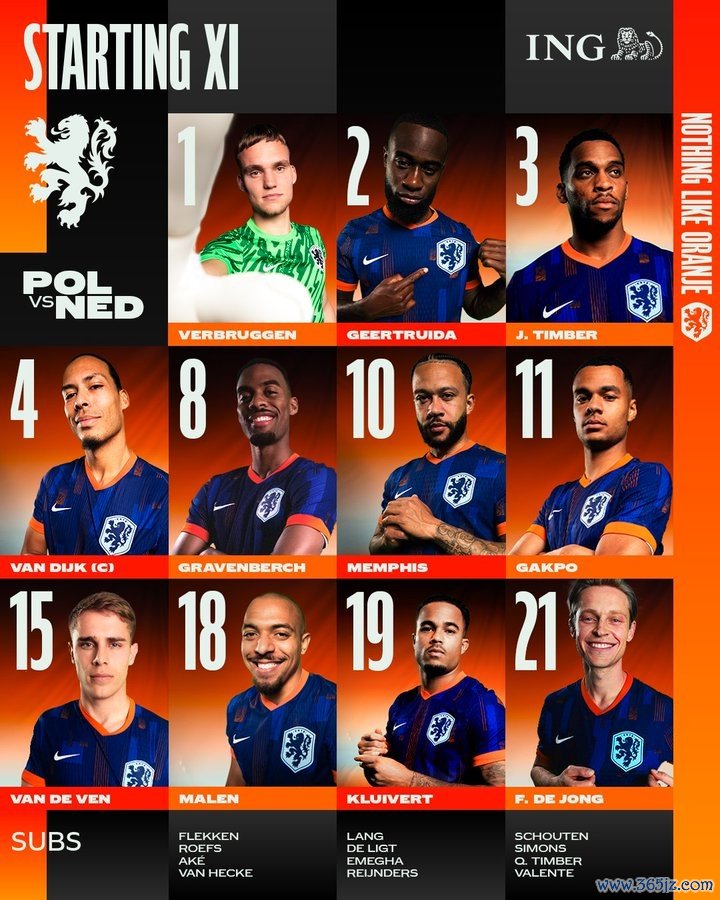 1-维尔布鲁根、2-海特勒伊达、3-尤里恩-廷伯、4-范戴克、8-赫拉芬贝赫、10-德佩、11-加克波、15-范德芬、18-马伦、19-小克鲁伊维特、21-弗兰基-德容