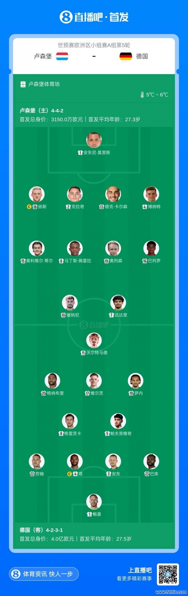 11月15日讯 世欧预A组第5轮,卢森堡迎战德国比赛行将打响。赛前首发出炉。