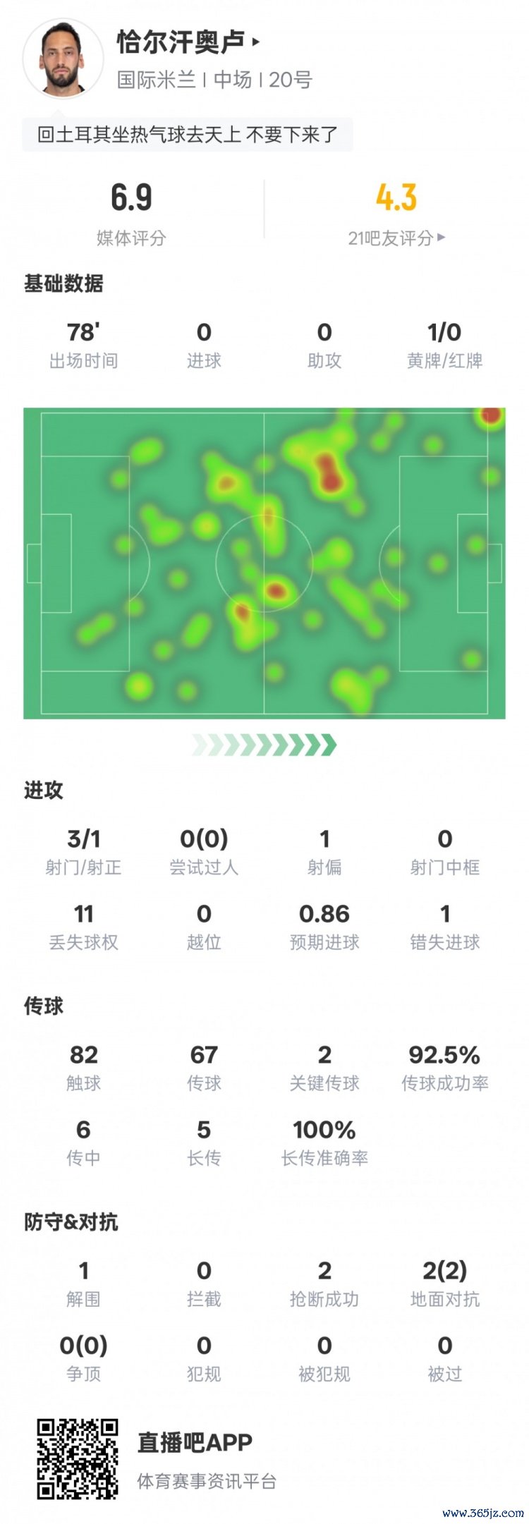 11月24日讯 意甲第12轮焦点战,国外米兰主场迎战AC米兰,恰尔汗奥卢首发出战,3射门1射正,送出2次要道传球,罚丢1粒点球,评分6.9。