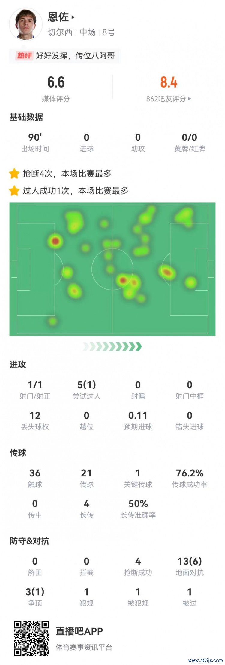 12月1日讯 切尔西在本轮英超1-1战平阿森纳,恩佐本场数据如下: