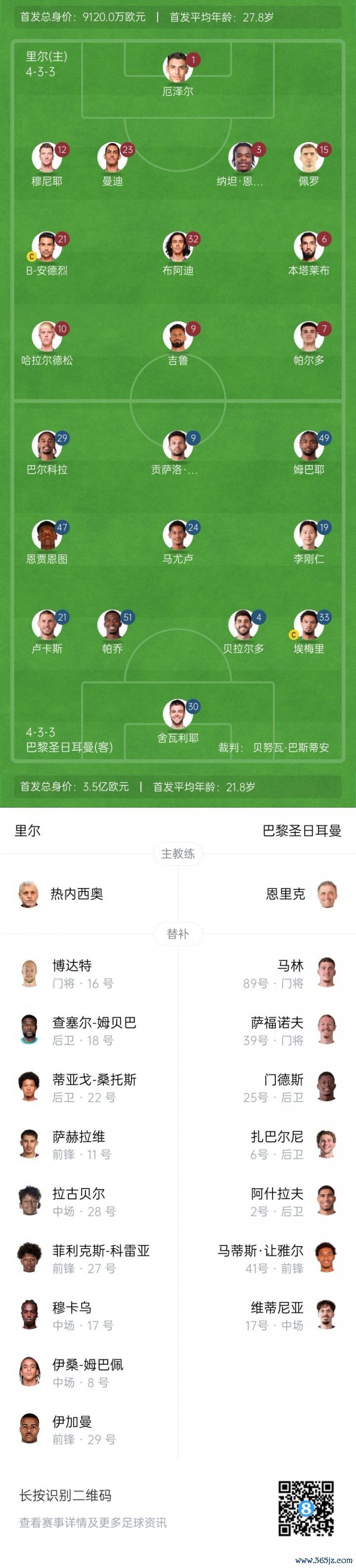 里尔替补:16-博达特、18-姆贝巴、22-蒂亚戈·桑托斯、8-伊桑·姆巴佩、11-萨赫拉维、17-穆卡乌、27-菲利克斯·科雷亚、28-拉古贝尔、29-哈姆扎·伊加曼