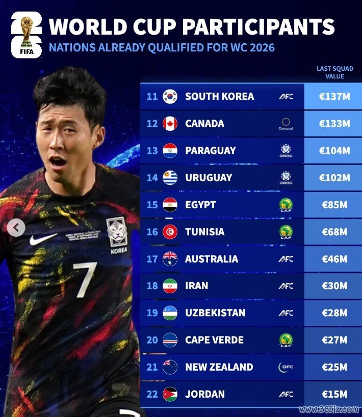 10月14日讯 德转列出一经锁定2026年寰球杯参赛经验的球队的身价名次榜,巴西、阿根廷前二,佛得角第20位。