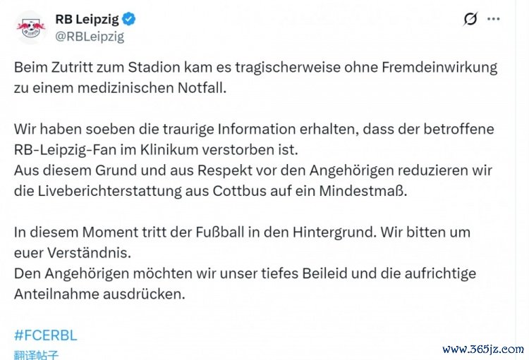 莱比锡俱乐部阐明,别称莱比锡球迷干预球场时发生贫穷医疗情况(与外部身分无关),被送往病院,最终在病院死字,莱比锡俱乐部社媒因此将这场比赛的直播报说念减少到最低终结,并向家属默示真切慰问。