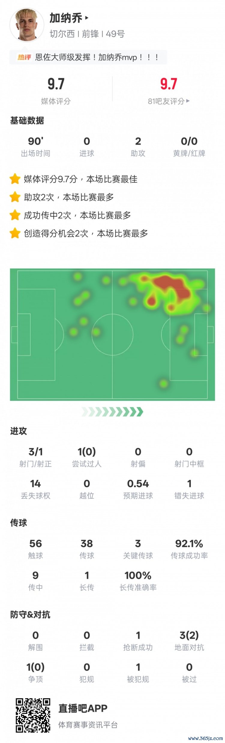 11月9日讯 2025-26赛季英超联赛第11轮,切尔西主场3-0驯顺狼队。加纳乔首发出战,孝敬2次助攻,送出3次关节传球,传球生着力92.1%,评分9.7全场最高。
