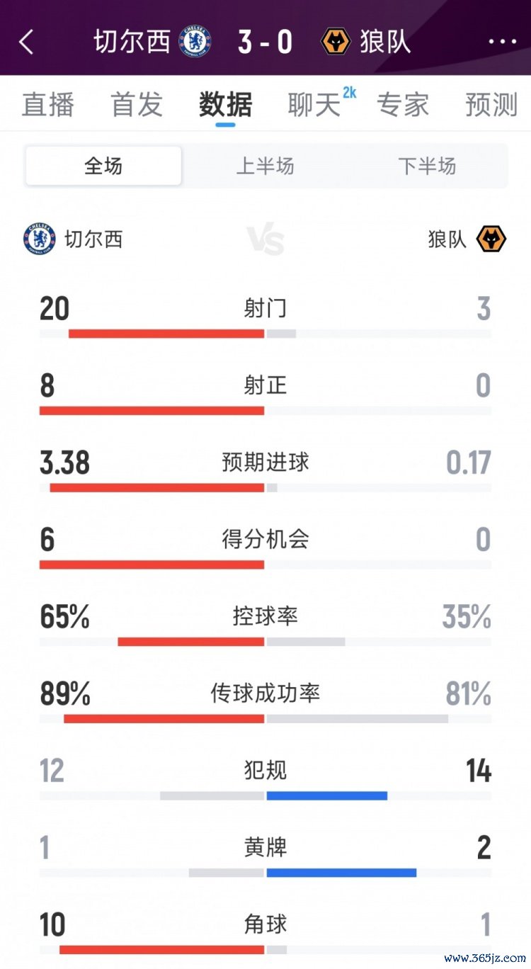 11月9日讯 在本轮英超,切尔西3-0打败狼队。以下为两边全场数据对比: