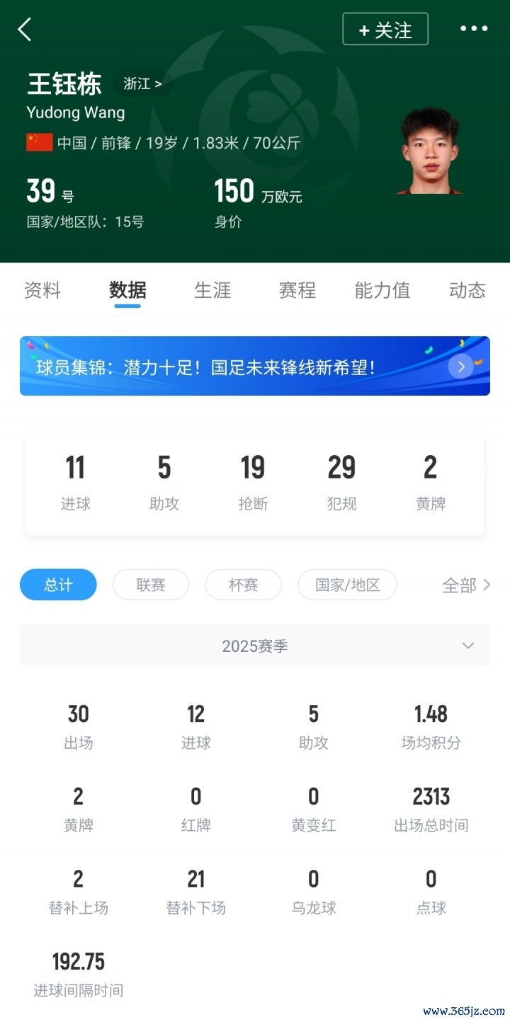 本赛季王钰栋共为浙江队出战30场比赛,孝敬12球5助,拿下中超原土弓手王。