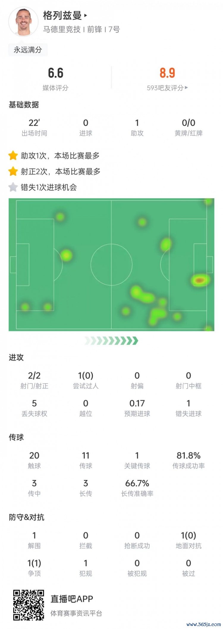 11月27日讯 欧冠联赛阶段第5轮比赛,格列兹曼替补出场,角球送出绝杀助攻,匡助马竞主场2-1打败国米。