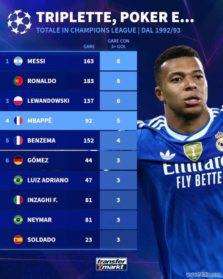 11月27日讯 德国转会商场统计了1992-1993赛季欧冠改制以来球员单场进球3+的场次,比肩出榜单,梅西、C罗8场居首,莱万6场、姆巴佩5场。