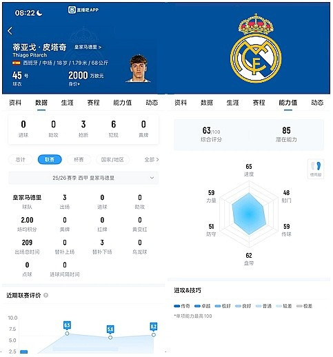 2026年3月3日,西甲第26轮,皇马主场作战 对阵赫塔费,皮塔奇首次代表白衣军团一线队杆位。在55分钟的出场时间内,皮塔奇完成55次触球,47脚传送球 有42次到位,传送球 成功率高达89%,创造了1次得分 机会,对于一名组织型中场球员来说,这样的数据已经足够优秀,不过考虑到皮塔奇也丢掉了7次球权,5次地面争抢有4次失败,其防卫 和抗压能力受到了质疑。