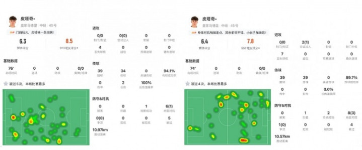 两局 对阵蓝月军团,皮塔奇表现地像一位久经战阵的老将。在金球先生面前,皮塔奇刷出了94%的传送球 成功率(34次传送球 32次到位),这其中有近一半的传送球 来自攻击 三区(16脚),长传成功率达到了惊人的100%(2次)。
