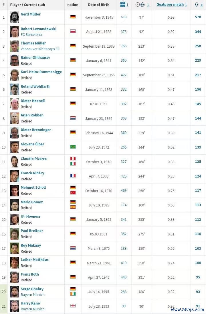 虎扑08月28日讯左证德国“转会市集”的统计,尽管加盟拜仁慕尼黑只是两年多的工夫,可是哈里-凯恩就仍是接近俱乐部历史向前20名的最好弓手。具体排行如下: