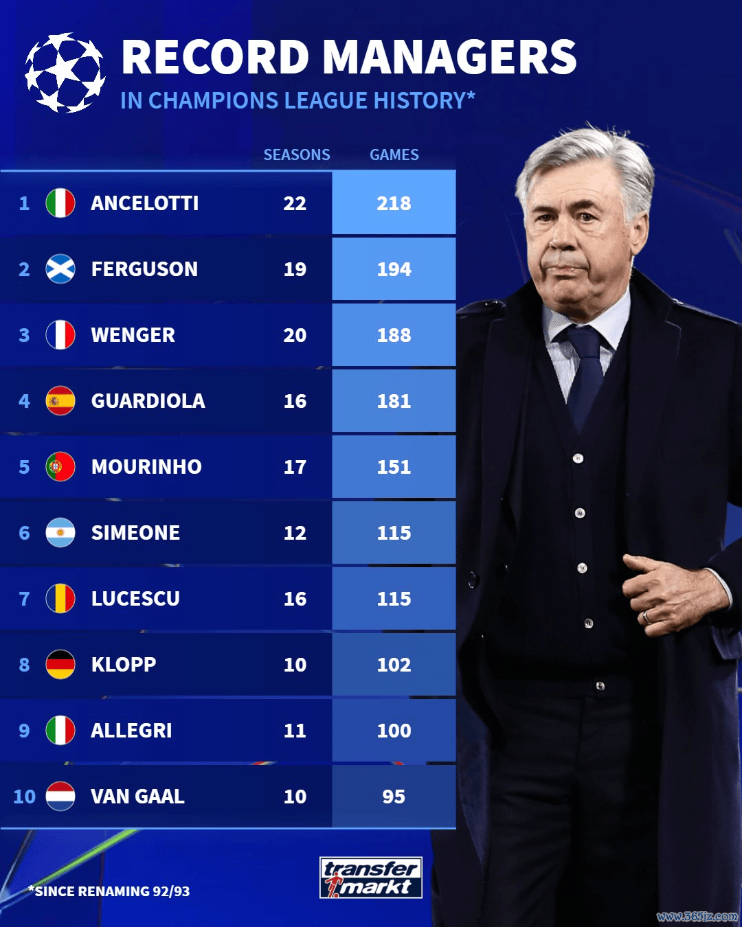 安切洛蒂在榜单中位居榜首且逾越上风罕见大。