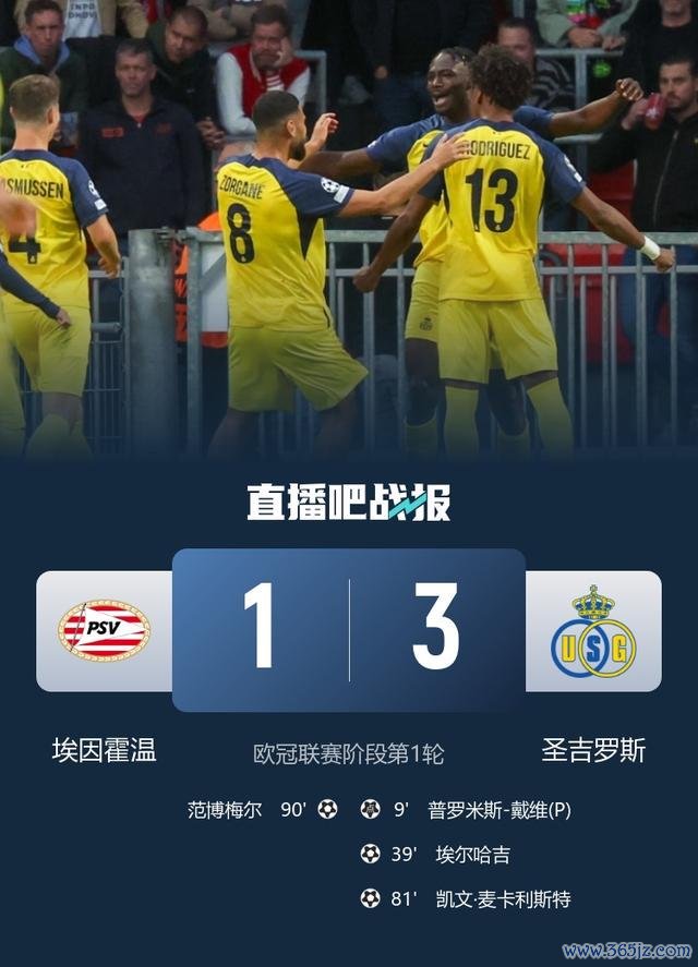全场比赛松手,埃因霍温主场1-3不敌圣吉罗斯。