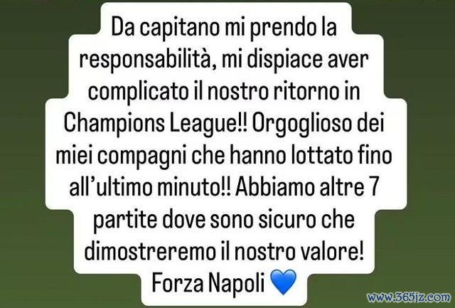 直播吧9月20日讯 那不勒斯队长迪洛伦佐在社媒发文,为我方在欧冠比赛中的红牌说念歉。