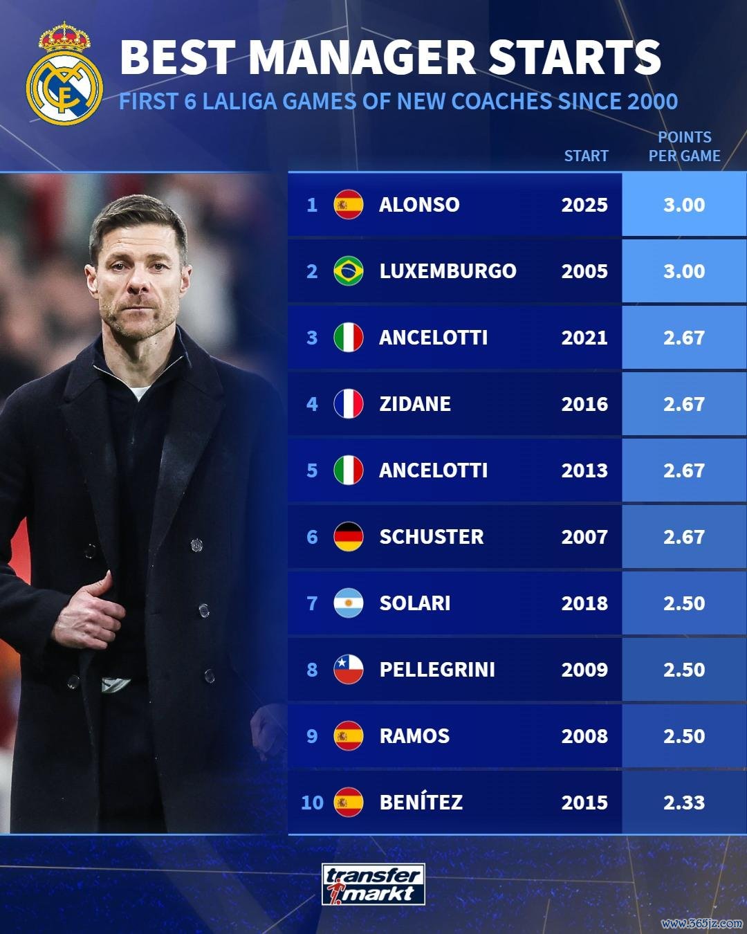虎扑09月24日讯德国转会市集统计了21世纪握教皇家马德里的讲明在前六场西甲联赛的场均积分,确定如下: