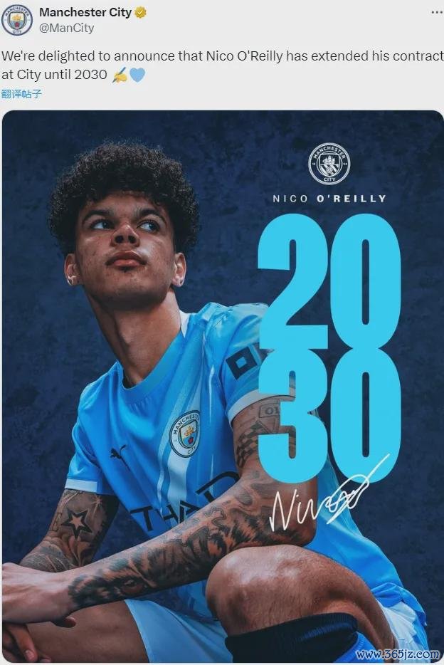 官方:曼城文书和尼科-奥赖利续约到了2030年。