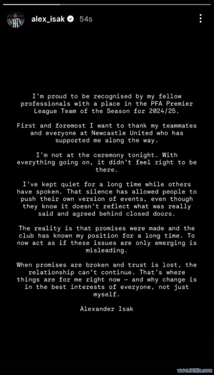 08月20日讯 伊萨克社媒发表声明,解说为何莫得出席PFA授奖庆典,况且谈及我方的转会传奇。