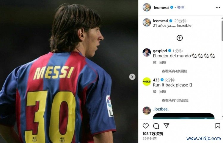 梅西发布了一张他身穿巴萨30号球衣的经典旧照,并配文写说念:“如故21年了……难以置信。”