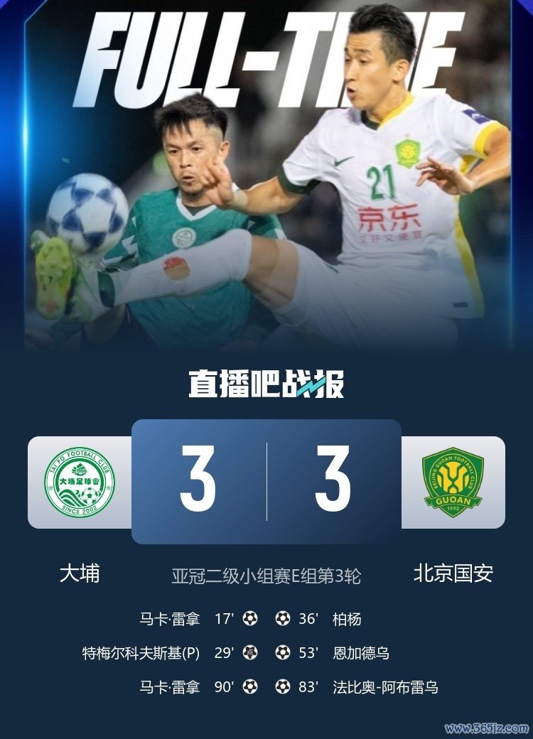 10月25日讯 在周中进行的亚冠二级联赛小组赛比赛中,北京国安客场3-3与中国香港球队大埔战平。