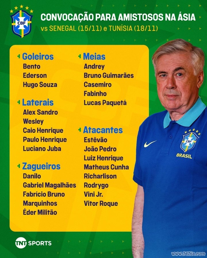 11月4日讯 巴西队官方公布本月国度队名单。维尼修斯领衔,罗德里戈、佩德罗、库尼亚、罗克、马尔基尼奥斯入选,10月份友谊赛2-3不敌日本队时献上战犯级默契的布鲁诺仍入选。内马尔仍无缘。
