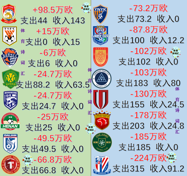 2、山东泰山【+15万欧】,没有支出,收入15万欧(石珂的数据未知)。