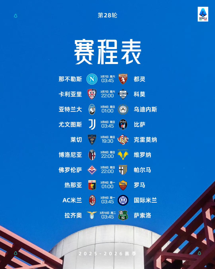 意大利时间3月7日至9日,意甲将迎来第28轮的10场较量。本轮焦点战非米兰德比莫属,国际米兰如果顺利取胜,提前夺冠将不在话下;而AC米兰携近六战不败的心理优势,将竭力保留争冠的微弱悬念。其他拼抢欧战的队伍集体面对中下游队伍的挑战;本比联赛季为保级而战的紫百合主战保级圈对手十字军也是为数不多的焦点对决,唯一一次保级对手的直接对话在莱切与升班马克雷莫纳直接展开。