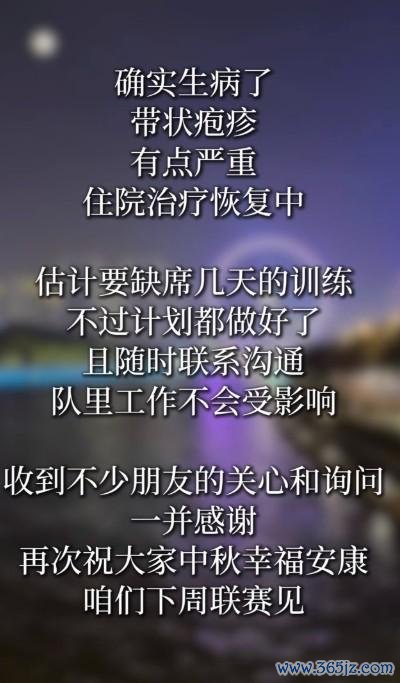 10月7日,天津津门虎主帅于根伟通过酬酢媒体账号泄漏,我方得了带状疱疹,有点严重,一经入院养息收复。