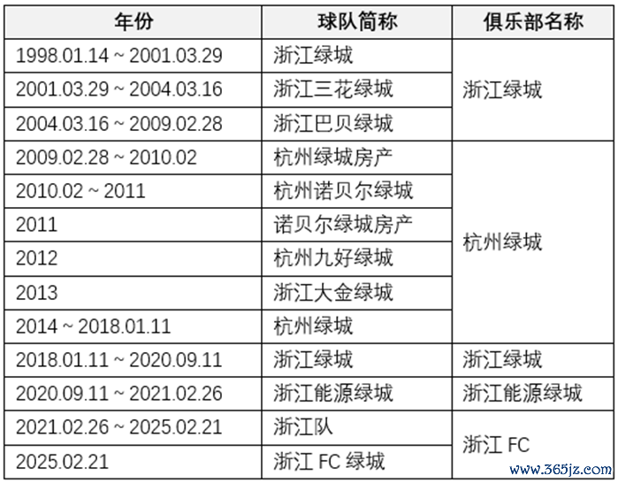 参考贵寓维基百科:浙江工作足球俱乐部英文维基百科:Zhejiang Professional F.C.百度百科:浙江工作足球俱乐部浙江工作足球俱乐部.俱乐部厚爱启用新版logo:21年,从未改换的是咱们的绿色梦思[Z/OL].公众号.(2019.01.14).https://mp.weixin.qq.com/s/pfi03bD5W5OfINlljgtABg.胡昊.9年后,“浙江绿城”归来了 中国足协公示杭州绿城股权变更[Z/OL]. 浙江在线.(2018.01.11).https://zjnews.zjol.com.cn/zjnews/201801/t20180111_6307840.shtml.新华社体育.浙能集团入股 浙江绿城厚爱改名浙江动力绿城[Z/OL].百度.(2020.09.11).https://baijiahao.baidu.com/s?id=1677526925170959771&wfr=spider&for=pc.杭州日报.告别“绿城”!改名为“浙江工作足球俱乐部”[Z/OL].百度.(2021.02.26).https://baijiahao.baidu.com/s?id=1692725686047377751&wfr=spider&for=pc.杭州日报.再次冠名!中超再会绿城足球队[Z/OL].百度.(2025.02.21).https://baijiahao.baidu.com/s?id=1692725686047377751&wfr=spider&for=pc.半岛网-城市信报.吴金贵被劫夺相通权队委会接管 奇闻开中超先河[Z/OL].搜狐体育.(2011.10.17).https://sports.sohu.com/20111017/n322435273.shtml.